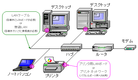 [ルーター][ハブ][LANケーブル][LANボード]が必要となります。