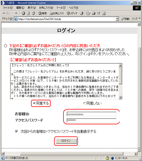 「次回からお客様ID・アクセスパスワードを自動的に自動表示する」にチェック