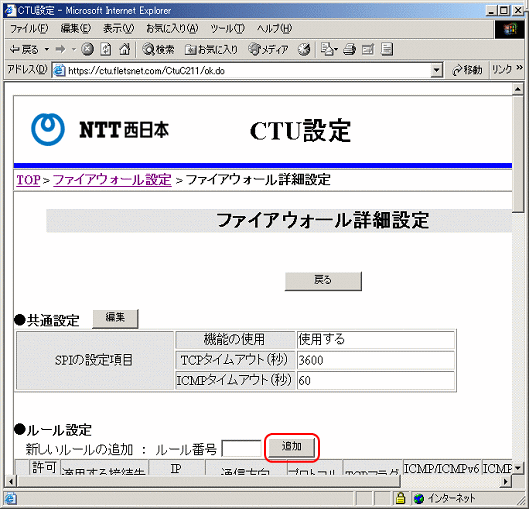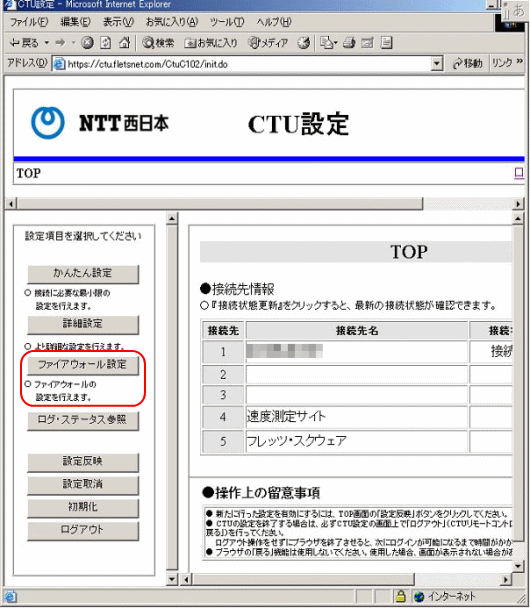 CTU設定画面の左メニューにある「ファイアウォール設定」をクリック