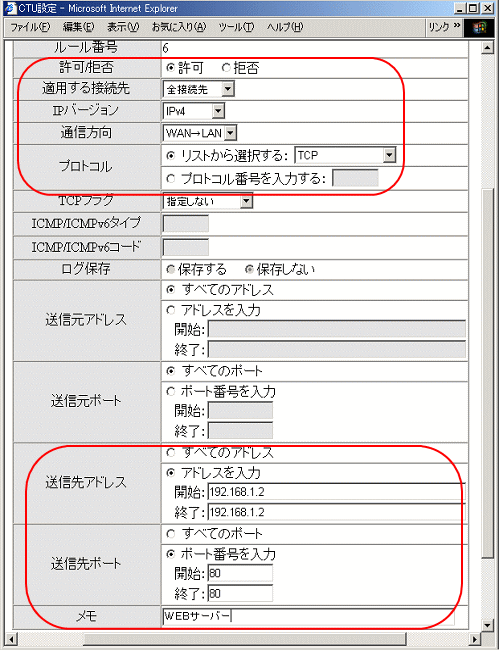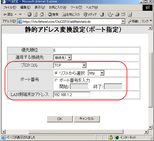 変換先に当たるLAN側端末IPアドレスの入力(ファイアウォール設定時と同様)