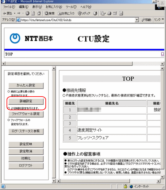 CTU設定画面の左メニューにある「詳細設定」をクリック