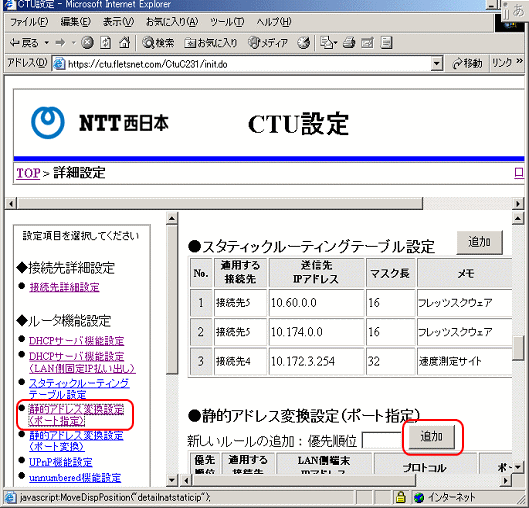 ●静的アドレス変換設定(ポート指定)の「追加」をクリック
