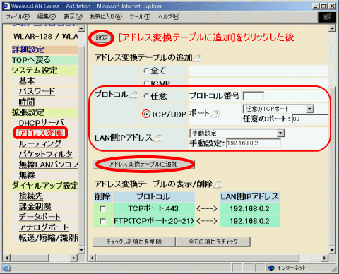 [アドレス変換テーブルに追加]をクリック