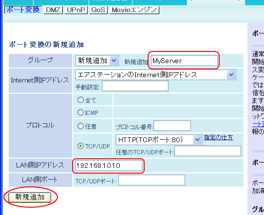 ここでは、自宅サーバーのweb公開用のポートのアドレス変換を例にしております。