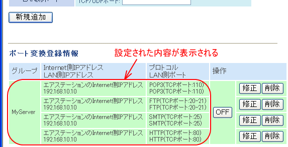 ここでは、FTP用のポートのポートのアドレス変換を例にしております。