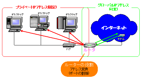プロバイダーからもらった1つのグローバルIPアドレスLAN内の複数のパソコンで同時に使用することができます。