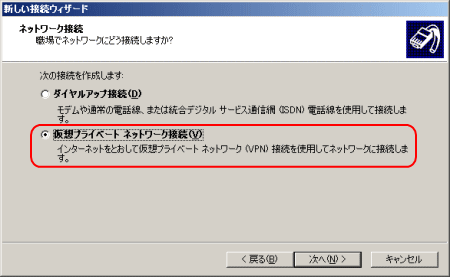 「仮想プライベートネットワーク接続(V)」にチェックを入れて[次へ(N)>]をクリック