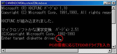 以下のようなコマンドプロンプトが立ち上がり、FDドライブを問われます。