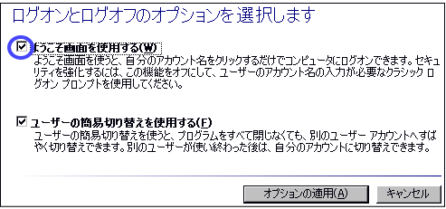 WinXPの場合は「ようこそ画面」を使用することにより、ログオンの簡素化が図れます。