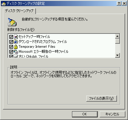 「削除するファイル(F)」にある項目で必要なものにチェックして[OK]